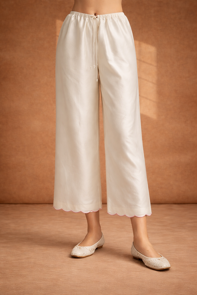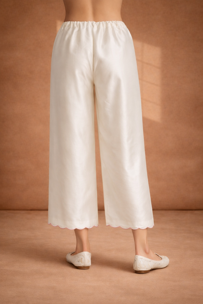 IVORY SILK CHANDERI PALAZO WITH DELICATE PINK SCALLOP BORDER