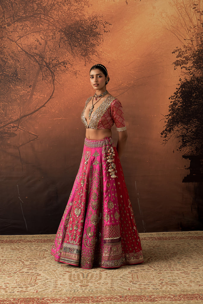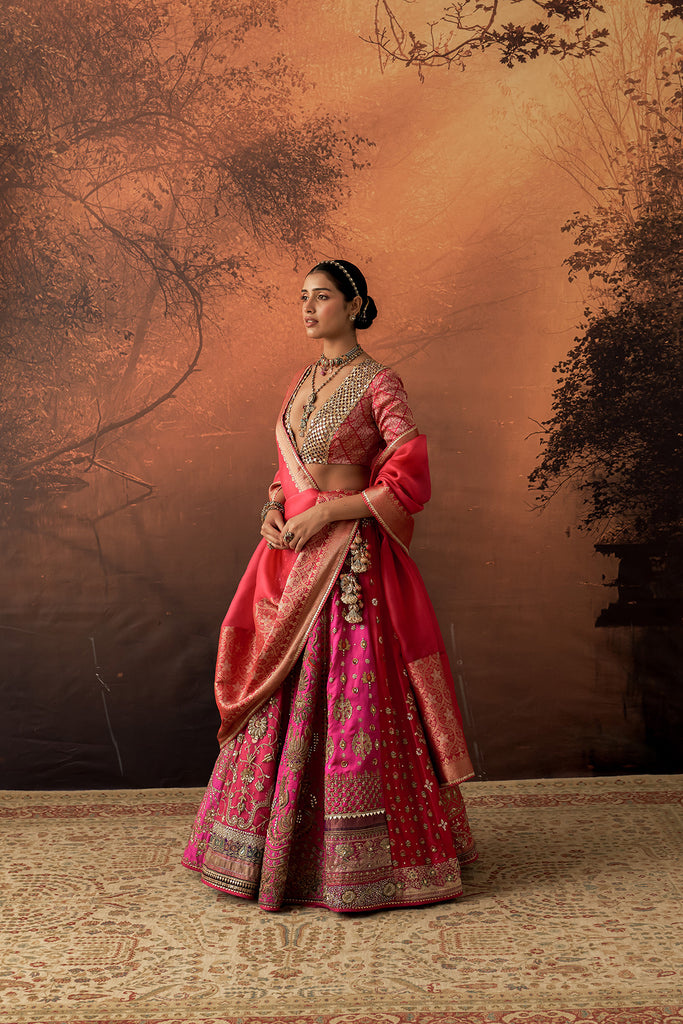 HOT PINK TISSUE EMBROIDERED LEHENGA WITH ATTACHED CRINO & HOT PINK BROCADE EMBROIDERED BLOUSE WITH HOT PINK ORGANZA BROCADE EMBROIDERED DUPATTA (3 PCS)