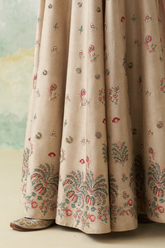 TOOSH DUPION PRINTED WITH HAND KASHMIRI EMBROIDERED LEHENGA WITH TOOSH BUSTIER & BLUSH PINK THIN CHANDERI KASHMIRI EMB. KURTA PAIRED WITH ORGANZA OMBRE DUPATTA (4 PCS)