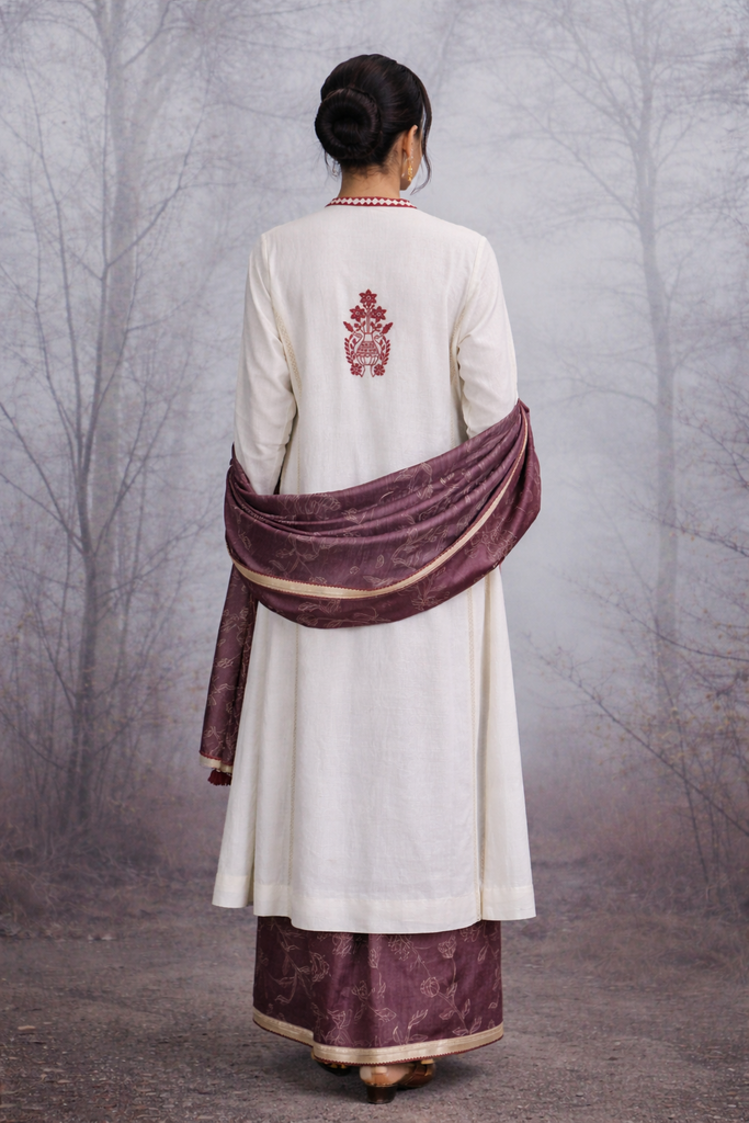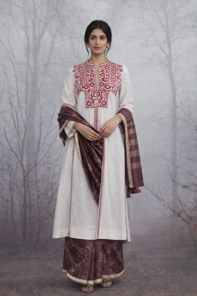 An ivory linen jacket featuring bold red embroidery inspired by traditional motifs, designed with a straight, easy silhouette. It is styled with a brown tussar silk saree showcasing subtle woven florals and a soft, earthy sheen
