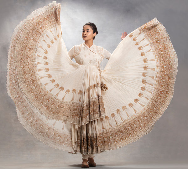 Ivory silk mul-mul & gauze self embroidered and block printed Angrakha paired with matching cotton churidar.