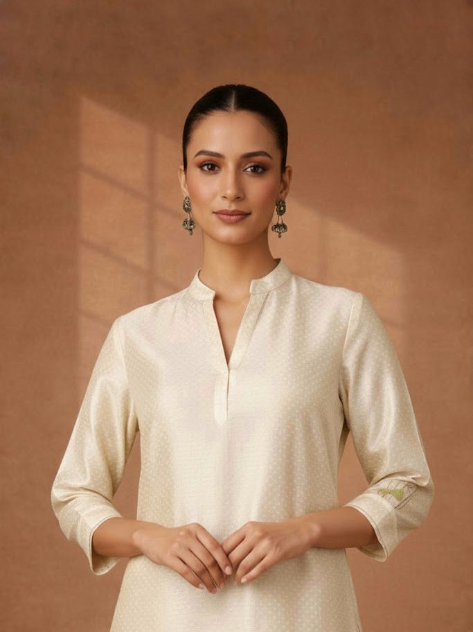 This ivory two-piece set is made in classic Chanderi fabric, offering a clean silhouette with understated charm. Elegant yet easy, it works beautifully for both day and evening wear.