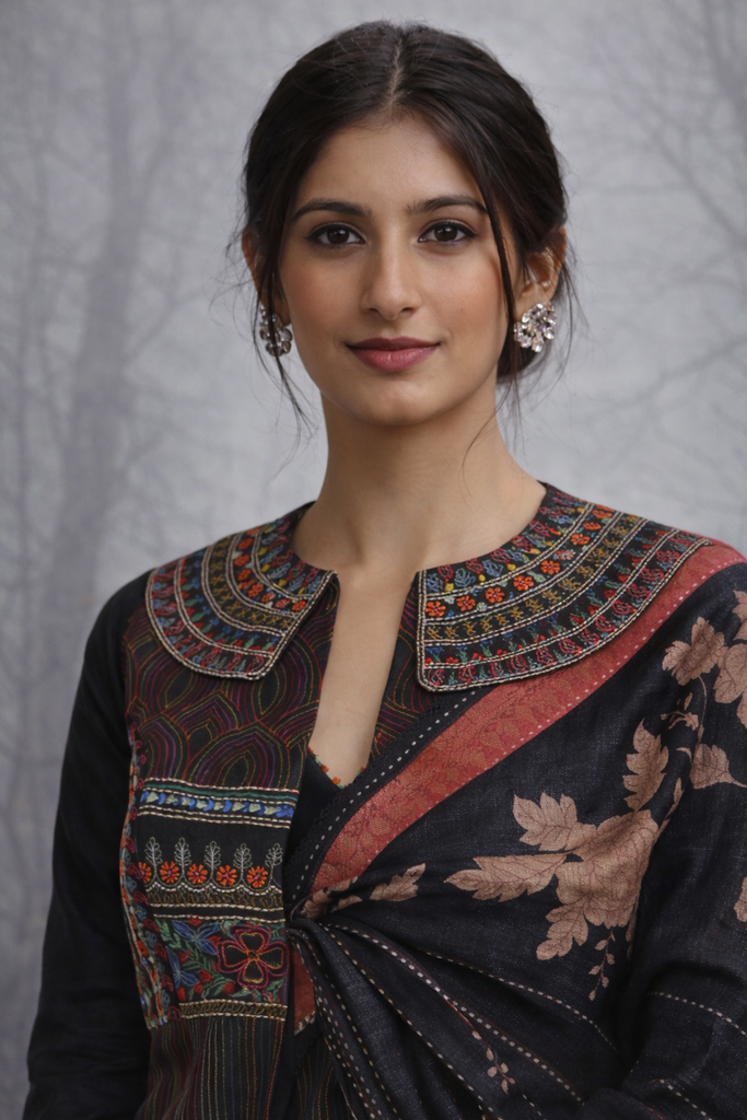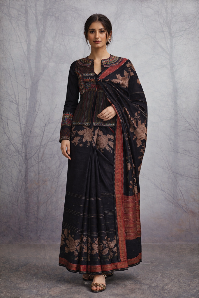 A black Dupion silk embroidered jacket paired with a black Tussar silk printed saree. The jacket features detailed hand embroidery, while the saree adds a soft, fluid drape, together creating a balanced and elegant look.