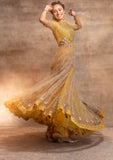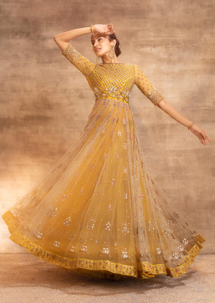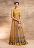 Antara Anarkali set showcases a plethora of zardozi embroidery patterns spread over a yellow canvas of Tulle with a full length tulle skirt.