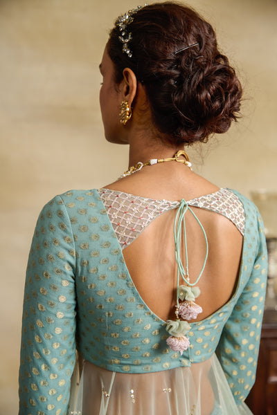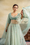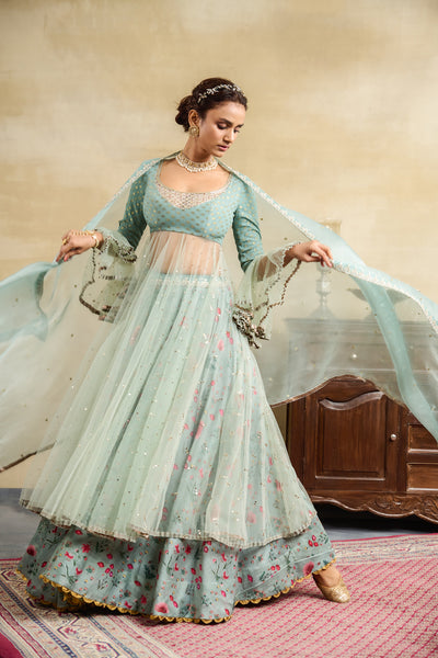 AQUA SILK GEORGETTE & TULLE EMBROIDERED ANARKALI PAIRED WITH AQUA SILK CHANDERI FLORAL PRINTED LEHANGA & AQUA SILK ORGANZA EMBROIDERED DUPATTA (3 PCS)