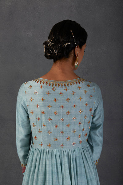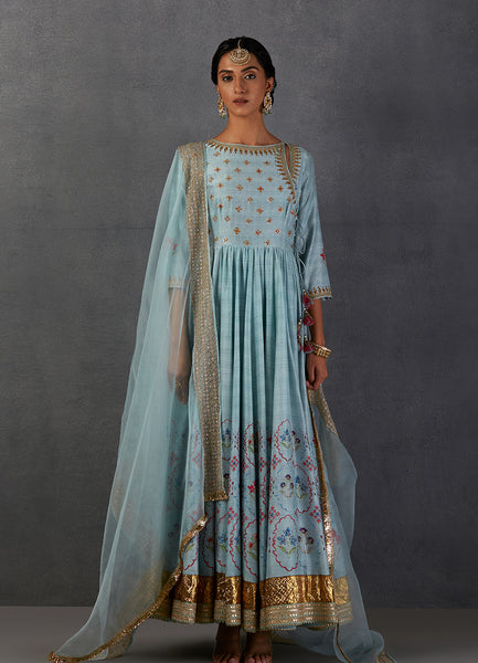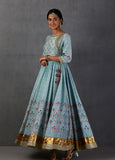AQUA SILK CHANDERI PRINTED & EMBROIDERED ANGRAKHA STYLE ANARKALI SET(FB-12A)