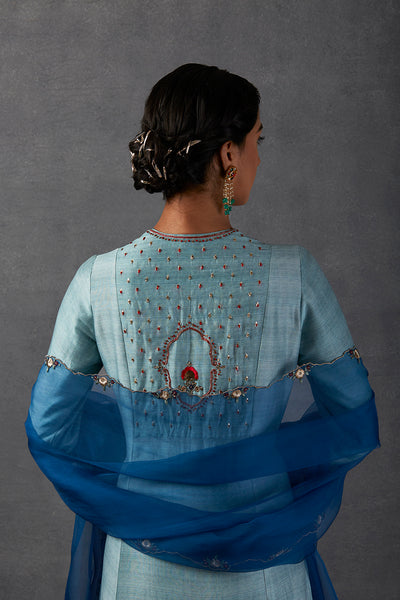 AQUA SILK CHANDERI PRINTED-EMBROIDERED FRONT OPEN ANGRAKHA KURTA PAIRED WITH BLUE COTTON & SILK ORGANZA EMBROIDERED PALAZZO AND BLUE SILK ORGANZA EMBROIDERED DUPATTA (3 PCS)