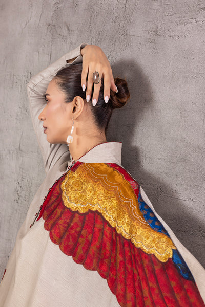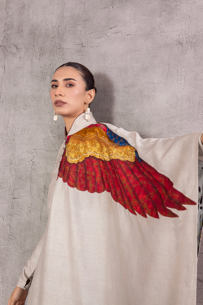 ASH GREY DUPION EMBROIDERED & BIRD PRINTED DRAPED TUNIC (1 PC)