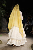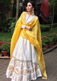 ATTRACTIVE BANARASI CUTWORK HIGH-LOW EMBROIDERED KURTI PAIRED WITH EYE CATCHING MINIATURE INSPIRE FOIL PRINTED LEHANGA AND MATCHING BUSTIER AND STYLE WITH EMBELLISHED HALDI YELLOW DUPATTA.