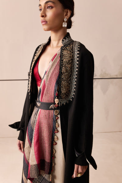 Black embroidered woolen overcoat
