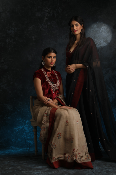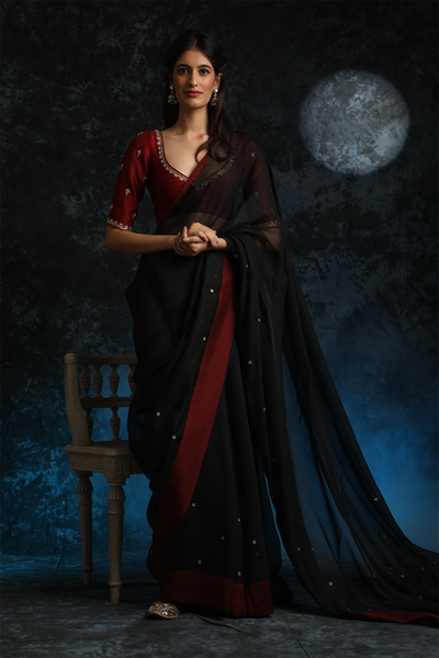 BLACK THIN CHANDERI EMBROIDERED SAREE WITH MAROON SILK DUPION BLOUSE PIECE (2 PCS)
