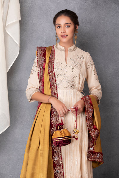 GOLD SILK MUSHROO DUSHALA WITH MARRON EMBROIDERED BORDER