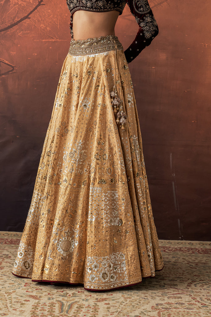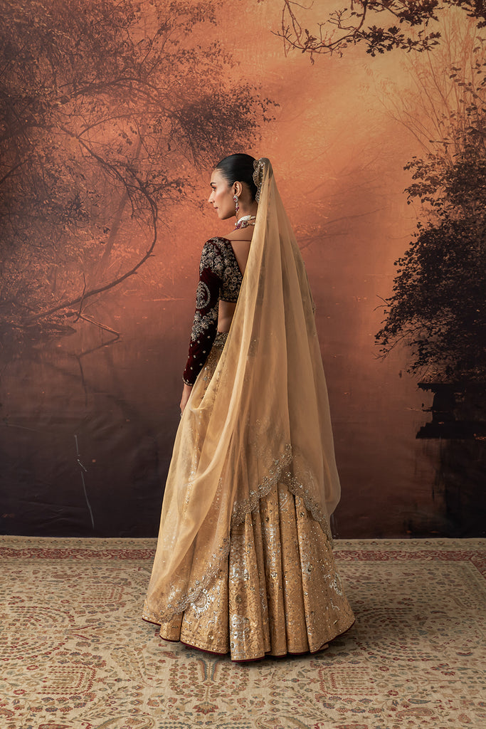 GOLD SILK TISSUE FOLI PRINTED & EMBROIDERED LEHENGA WITH CRINO & MAROON VELVET EMBROIDERED BLOUSE PAIRED WITH GOLD SILK TISSUE HEAVY EMBROIDERED DUPATTA (4 PCS)