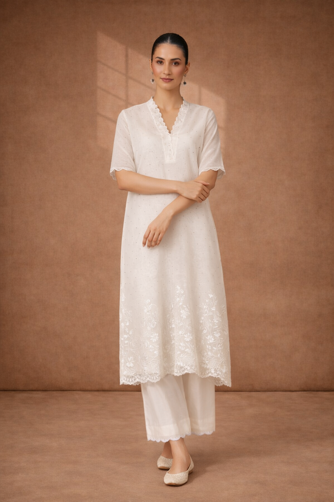Crafted in airy Chanderi, this ivory kurta features subtle surface embroidery and a clean, timeless silhouette. An easy, elegant piece suited for day wear and intimate occasions