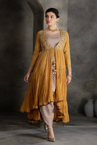 Yellow pure silk & cotton floral embroidered & gota detailed jacket paired with beige jari booti weaved short kurti and matching cotton gota detailed harem pants